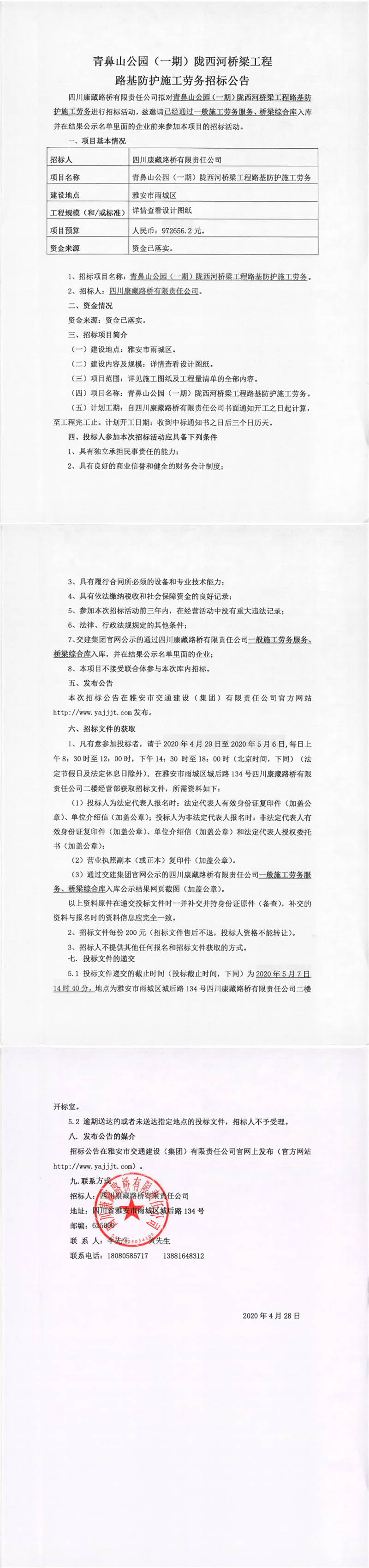 四川康藏路橋有限責任公司青鼻山公園(一期)隴西河橋梁工程路基防護施工勞務招標公告