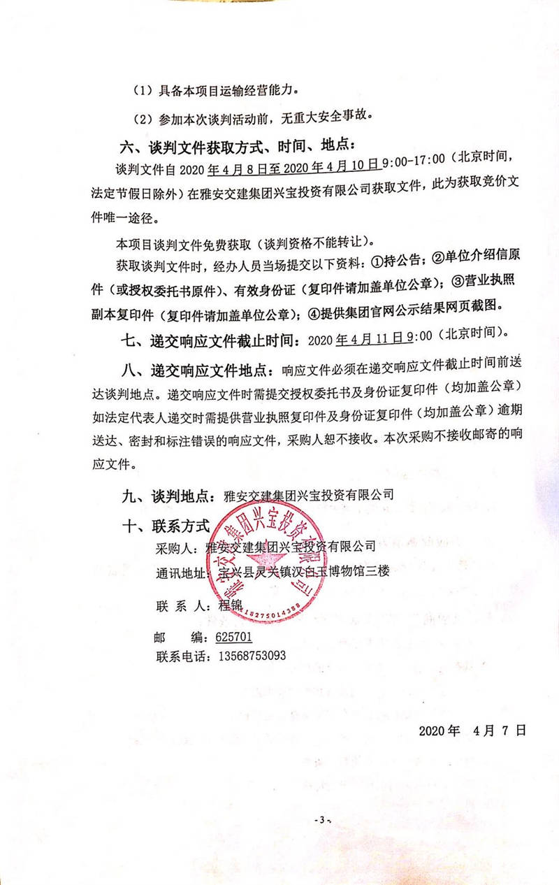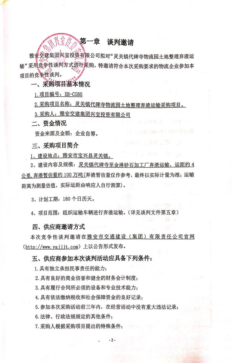 雅安交建集團興寶投資有限公司靈關鎮(zhèn)代碑寺物流園土地整理棄渣運輸采購項目競爭性談判公告