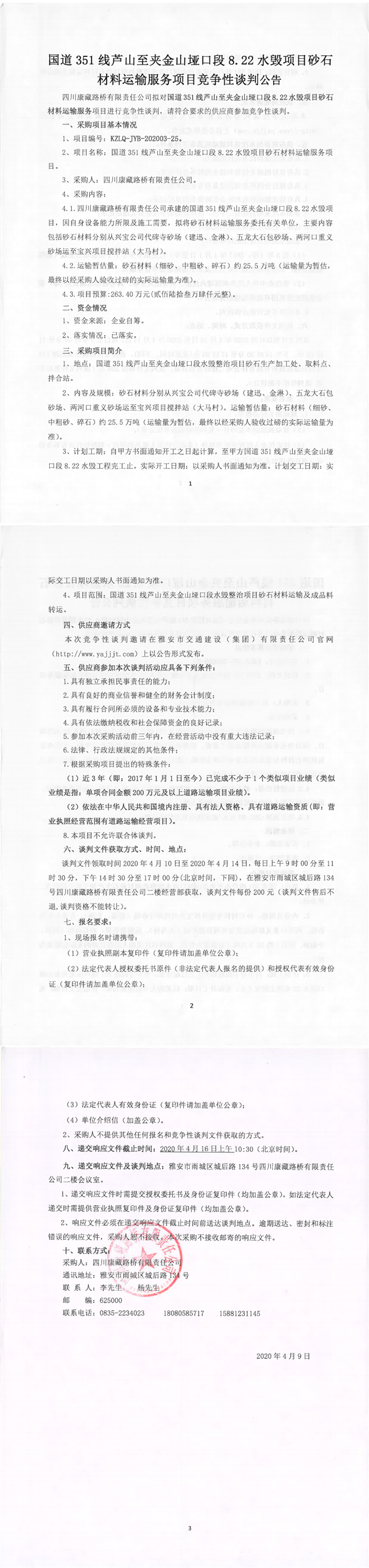 四川康藏路橋有限責(zé)任公司國(guó)道351線蘆山至夾金山埡口8.22水毀項(xiàng)目砂石材料運(yùn)輸服務(wù)項(xiàng)目競(jìng)爭(zhēng)性談判公告