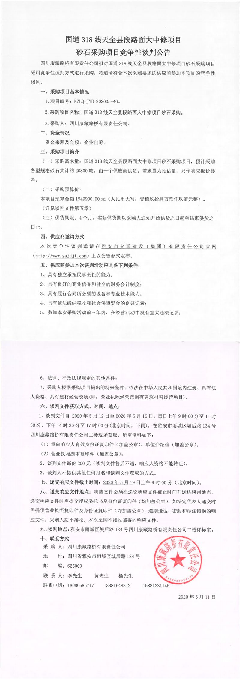四川康藏路橋有限責(zé)任公司國道318線天全縣段路面大中修項(xiàng)目砂石采購項(xiàng)目競(jìng)爭性談判公告