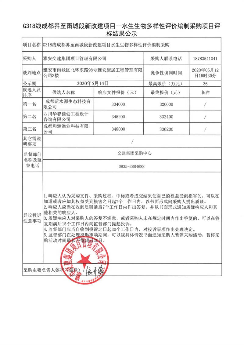 雅安交建集團項目管理有限公司G318線成都界至雨城段新改建項目水生生物多樣性評價編制采購項目評標(biāo)結(jié)果公示