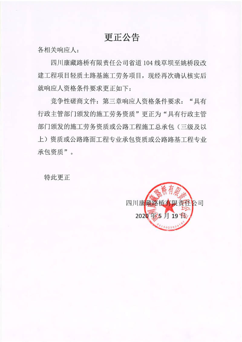 四川康藏路橋有限責(zé)任公司省道104線草壩至姚橋段改建工程項(xiàng)目輕質(zhì)土路基施工勞務(wù)項(xiàng)目更正公告