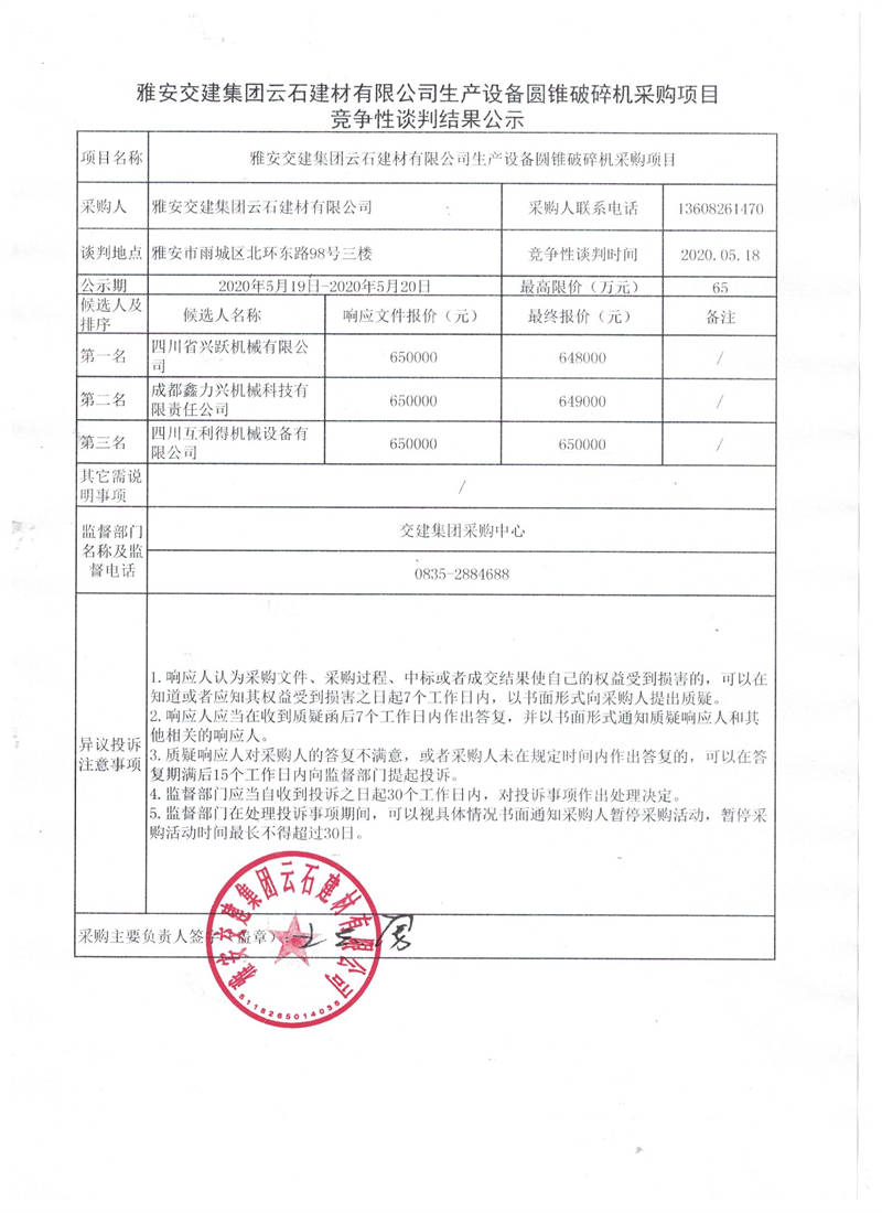 雅安交建集團云石建材有限公司生產(chǎn)設備圓錐破碎機采購項目競爭性談判結果公示