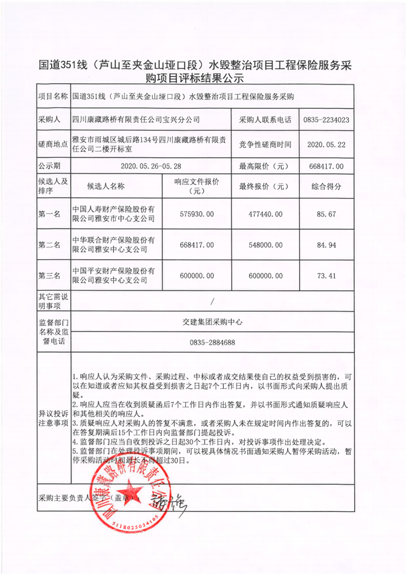 四川康藏路橋有限責(zé)任公司寶興分公司國道351線(蘆山至夾金山埡口段)水毀整治項(xiàng)目工程保險(xiǎn)服務(wù)采購項(xiàng)目評標(biāo)結(jié)果公示
