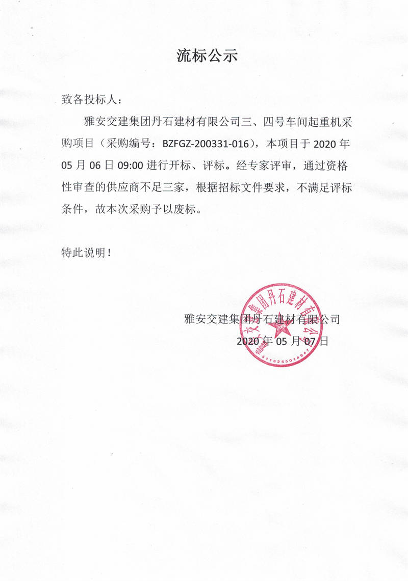 雅安交建集團(tuán)丹石建材有限公司三、四號(hào)車間起重機(jī)采購(gòu)項(xiàng)目流標(biāo)公示