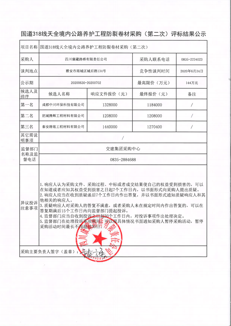 四川康藏路橋有限責(zé)任公司國道318線天全境內(nèi)公路養(yǎng)護(hù)工程防裂卷材采購(第二次)評標(biāo)結(jié)果公示