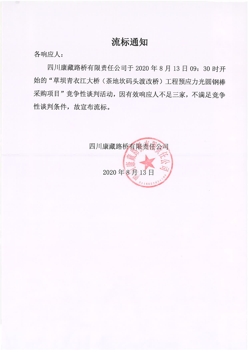 四川康藏路橋有限責(zé)任公司草壩青衣江大橋(茶地坎碼頭渡改橋)工程預(yù)應(yīng)力光圓鋼棒采購項(xiàng)目流標(biāo)通知