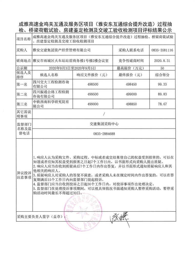 雅安交建集團(tuán)資產(chǎn)經(jīng)營管理有限公司成雅高速金雞關(guān)互通及服務(wù)區(qū)項目(雅安東互通綜合提升改造)過程抽檢、橋梁荷載試驗、房建鑒定檢測及交竣工驗收檢測項目評標(biāo)結(jié)果公示