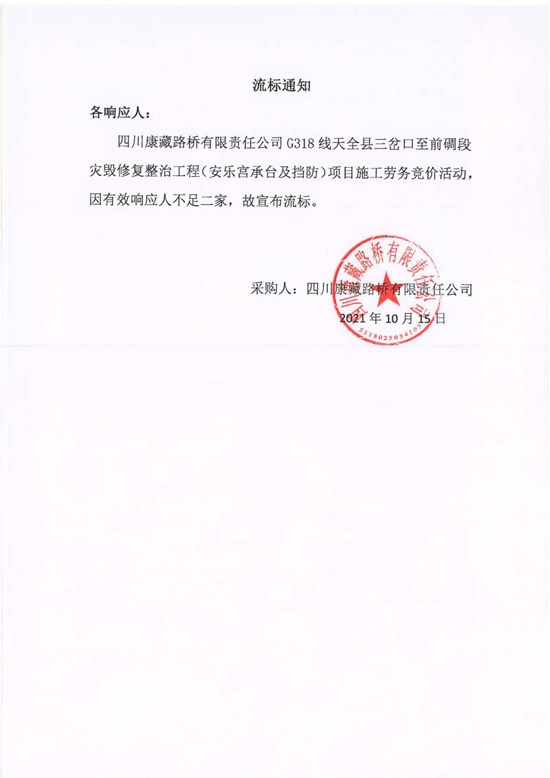 四川康藏路橋有限責(zé)任公司G318線天全縣三岔口至前碉段災(zāi)毀修復(fù)整治工程(安樂宮承臺及擋防)項目施工勞務(wù)流標(biāo)通知