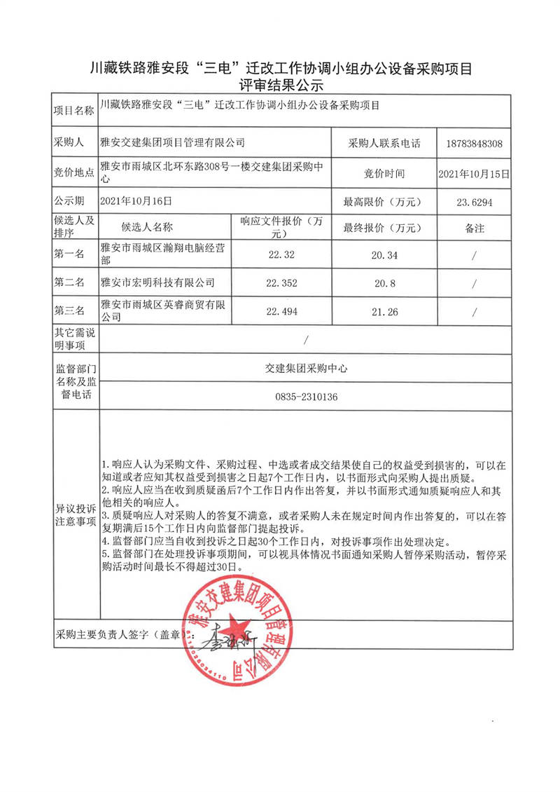 雅安交建集團項目管理有限公司川藏鐵路雅安段“三電”遷改工作協(xié)調(diào)小組辦公設(shè)備采購項目評審結(jié)果公示