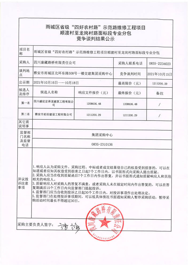 四川康藏路橋有限責(zé)任公司雨城區(qū)省級(jí)“四好農(nóng)村路”示范路維修工程項(xiàng)目順渡村至龍崗村路面標(biāo)段專業(yè)分包競爭談判結(jié)果公示