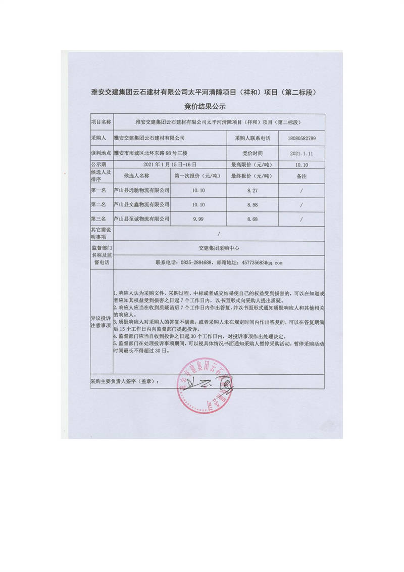 雅安交建集團(tuán)云石建材有限公司太平河清障項(xiàng)目(王河壩)項(xiàng)目(第一標(biāo)段)競(jìng)價(jià)結(jié)果公示