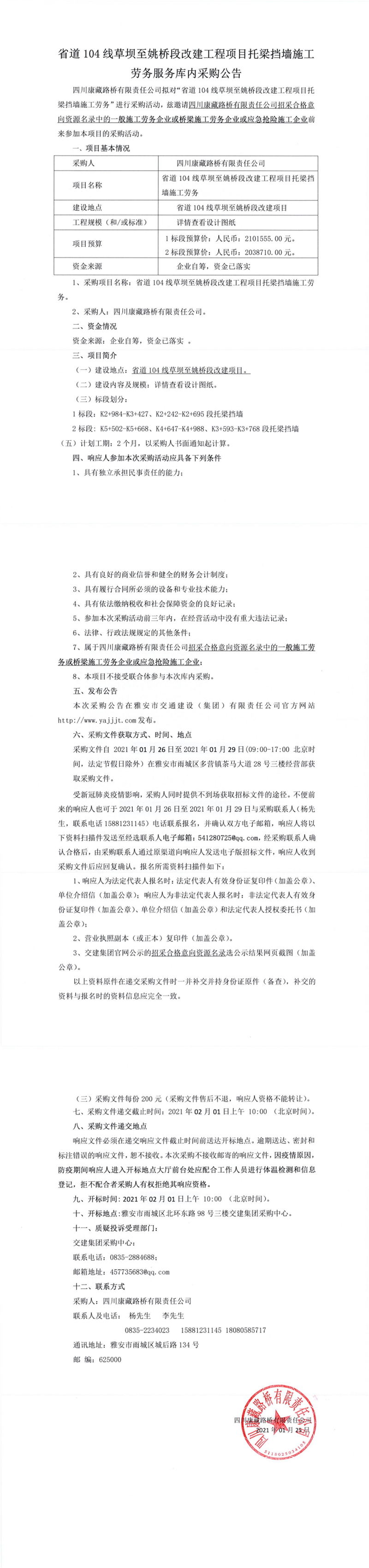 四川康藏路橋有限責任公司省道104線草壩至姚橋段改建工程項目托梁擋墻施工勞務(wù)服務(wù)庫內(nèi)采購公告
