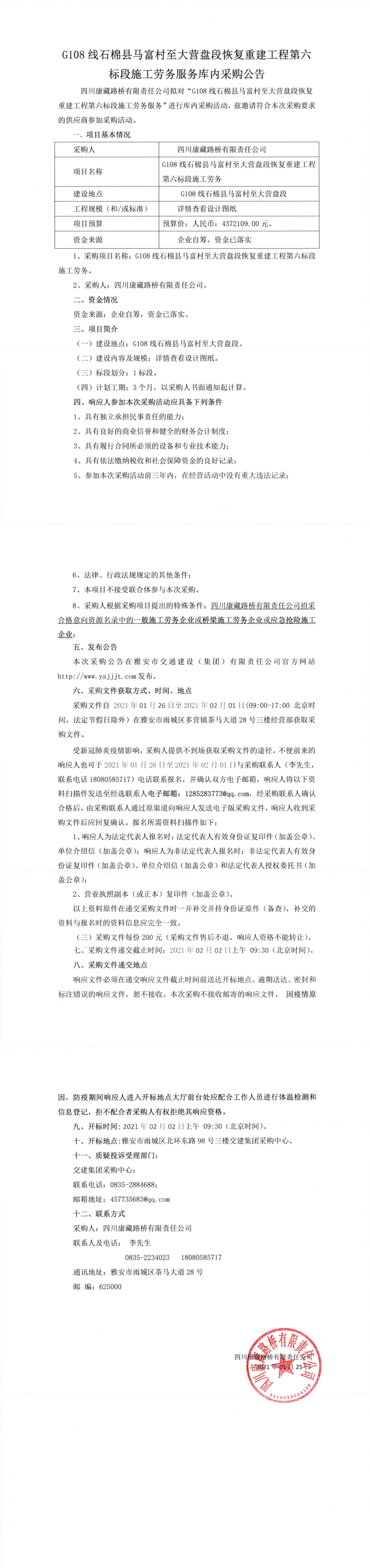 四川康藏路橋有限公司G108線石棉縣馬富村至大營(yíng)盤段恢復(fù)重建工程第六標(biāo)段施工勞務(wù)服務(wù)庫內(nèi)采購公告