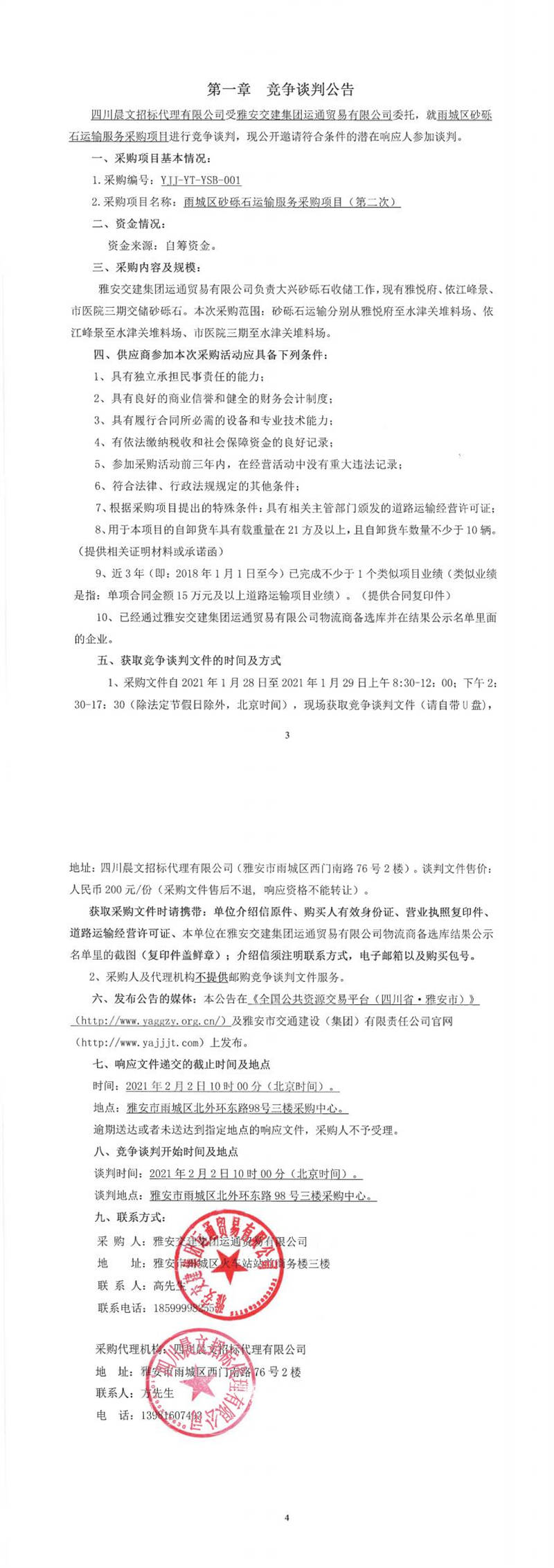 雅安交建集團(tuán)運(yùn)通貿(mào)易有限公司雨城區(qū)砂礫石運(yùn)輸服務(wù)采購項(xiàng)目(第二次)競(jìng)爭(zhēng)談判公告