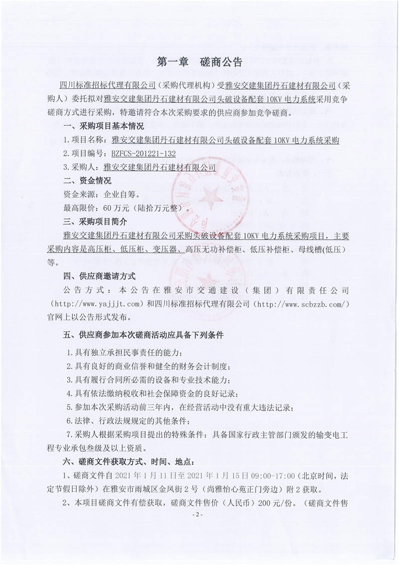 雅安交建集團(tuán)丹石建材有限公司頭破設(shè)備配套10KV電力系統(tǒng)競(jìng)爭(zhēng)磋商公告