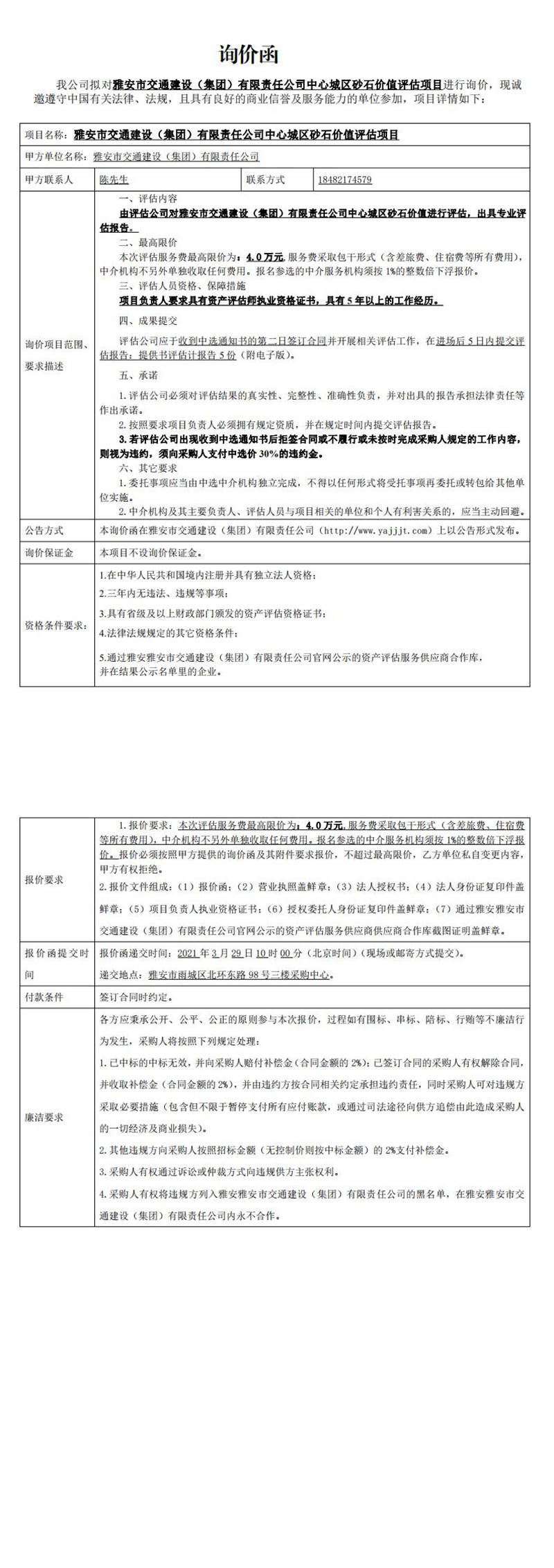 雅安市交通建設(shè)(集團(tuán))有限責(zé)任公司中心城區(qū)砂石價(jià)值評估項(xiàng)目詢價(jià)函