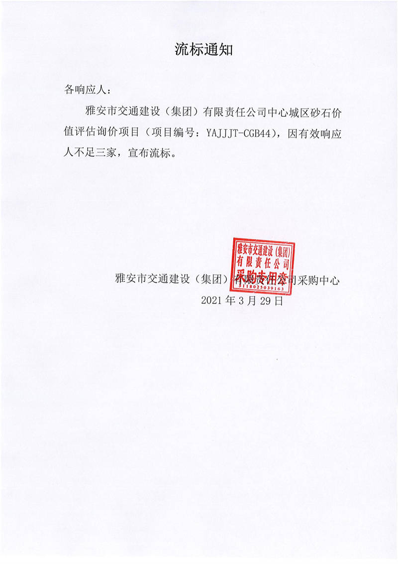 雅安市交通建設(shè)(集團)有限責任公司中心城區(qū)砂石價值評估項目流標通知