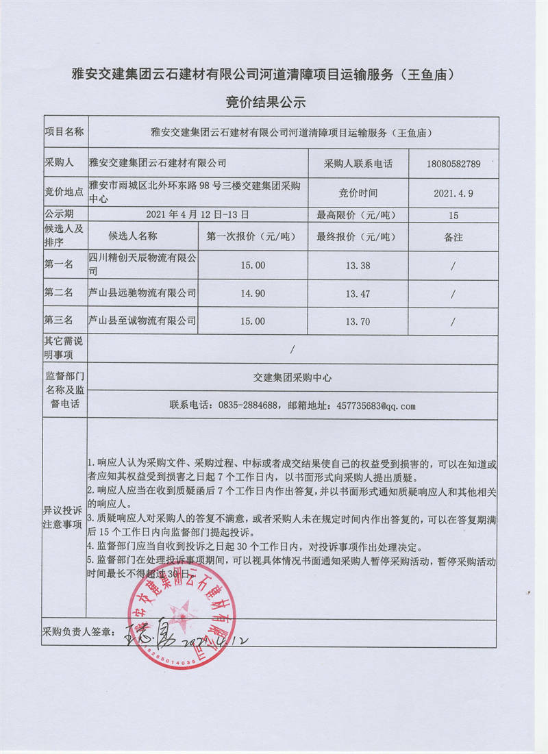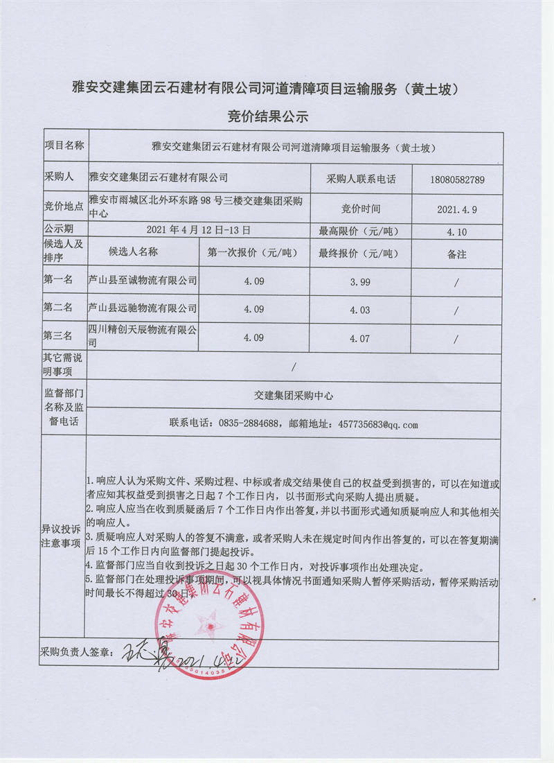 雅安交建集團(tuán)云石建材有限公司河道清障項(xiàng)目運(yùn)輸服務(wù)競價結(jié)果公示