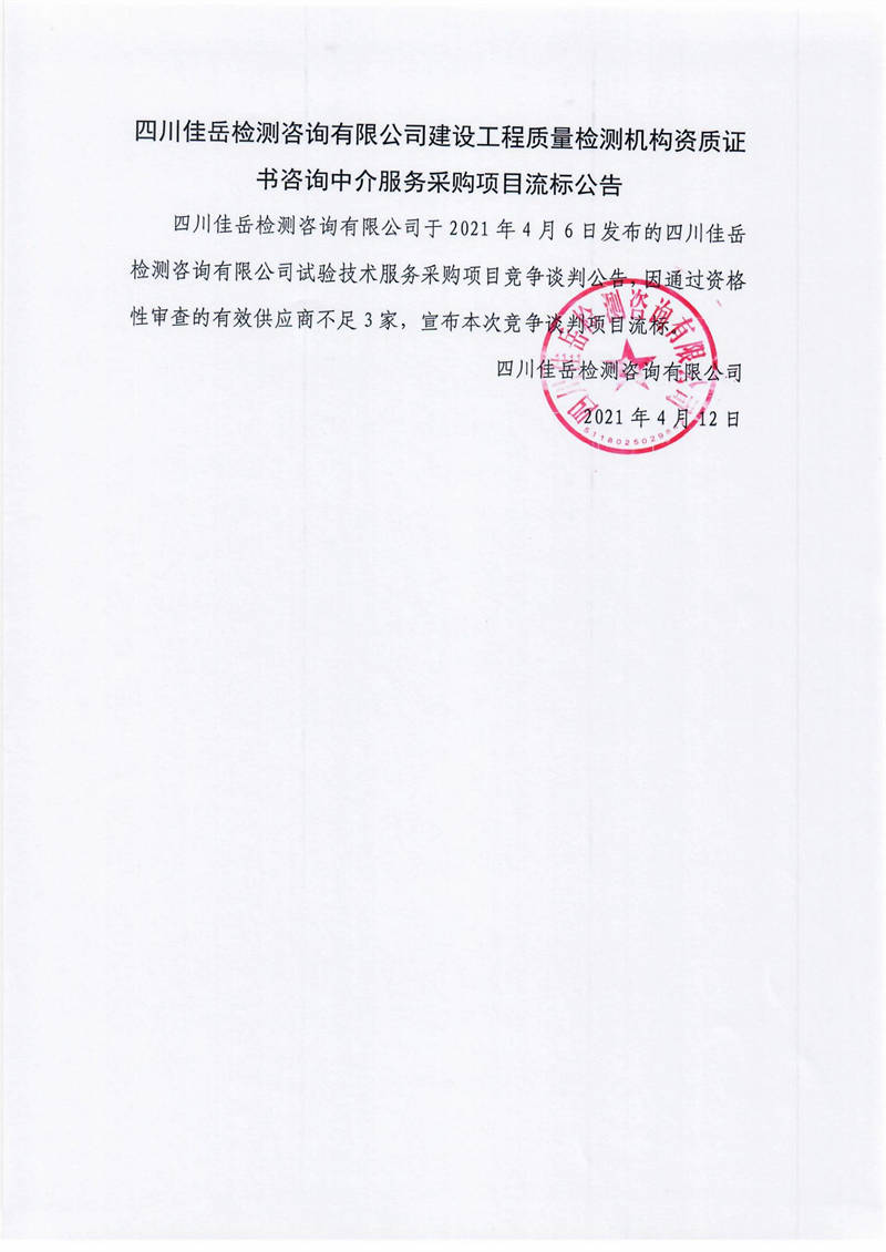 四川佳岳檢測咨詢有限公司建設(shè)工程質(zhì)量檢測機構(gòu)資質(zhì)證書咨詢中介服務(wù)采購項目流標公告