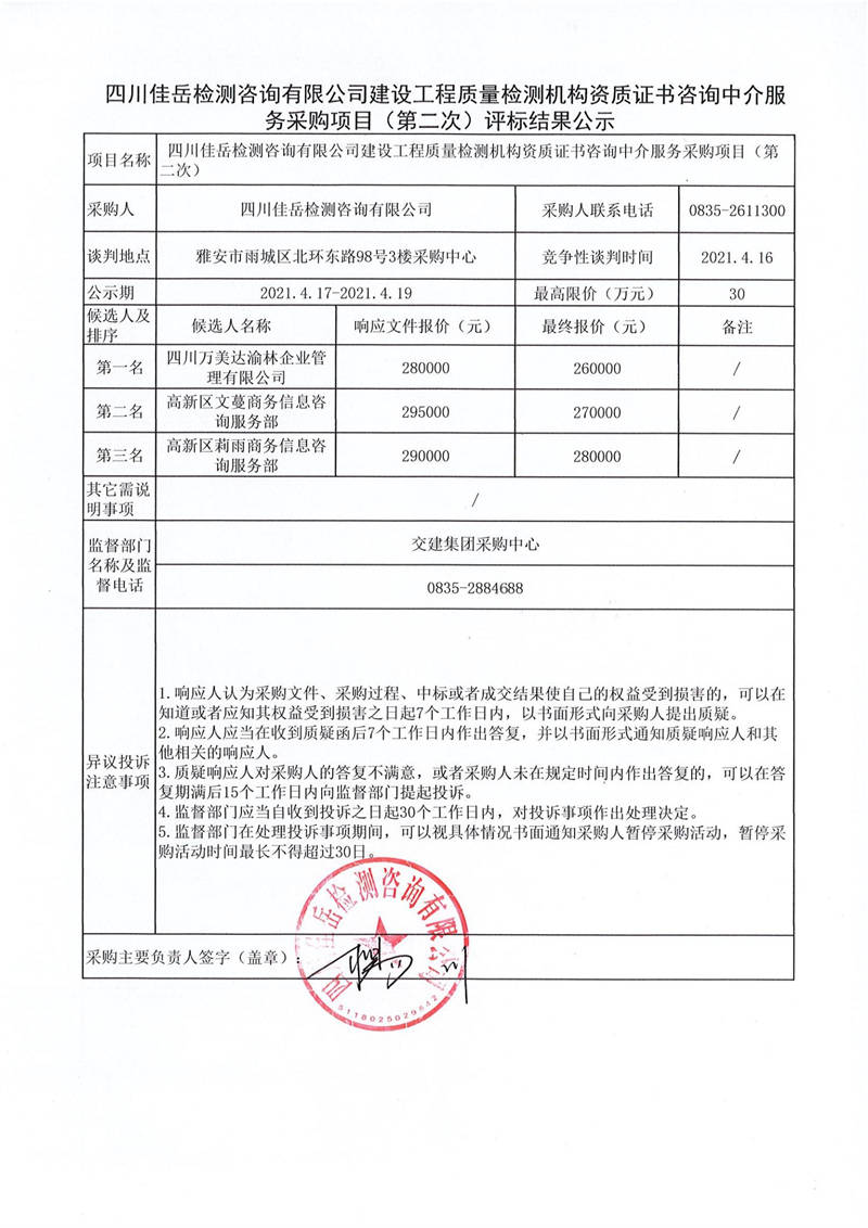 四川佳岳檢測咨詢有限公司建設(shè)工程質(zhì)量檢測機(jī)構(gòu)資質(zhì)證書咨詢中介服務(wù)采購項目(第二次)評標(biāo)結(jié)果公示