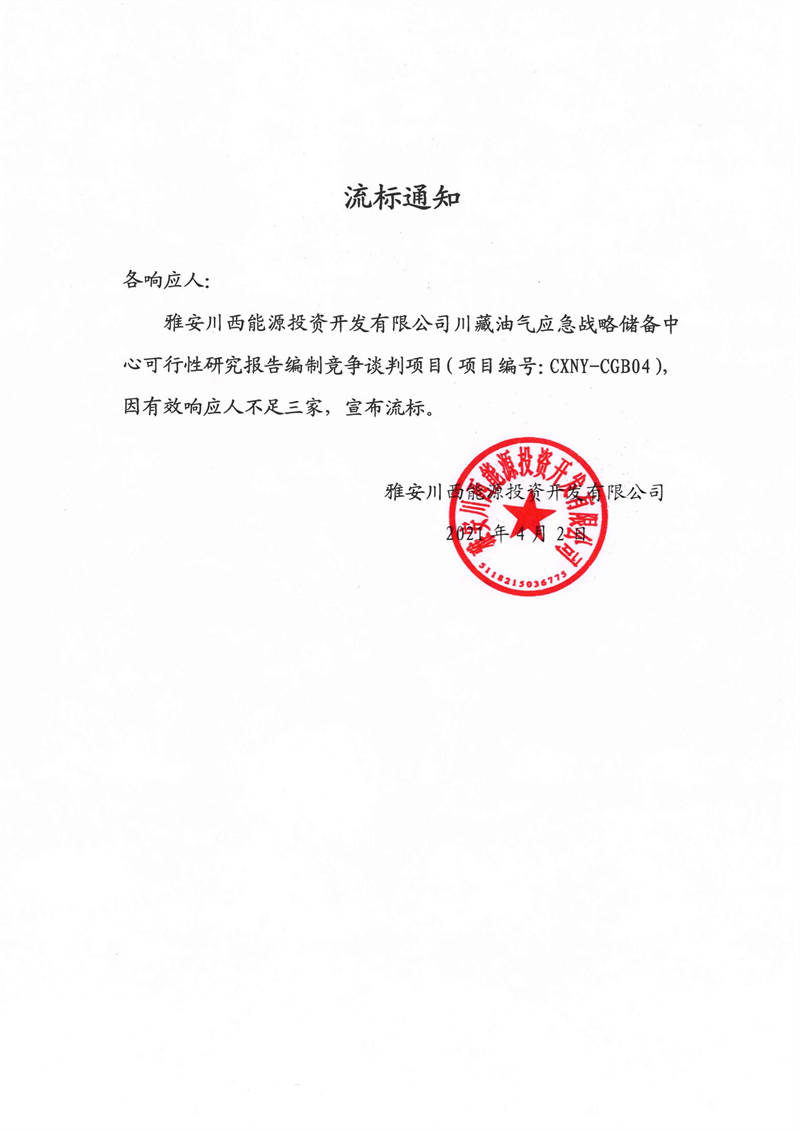 雅安川西能源投資開發(fā)有限公司川藏油氣應(yīng)急戰(zhàn)略儲(chǔ)備中心可行性研究報(bào)告編制競(jìng)爭(zhēng)談判項(xiàng)目流標(biāo)通知