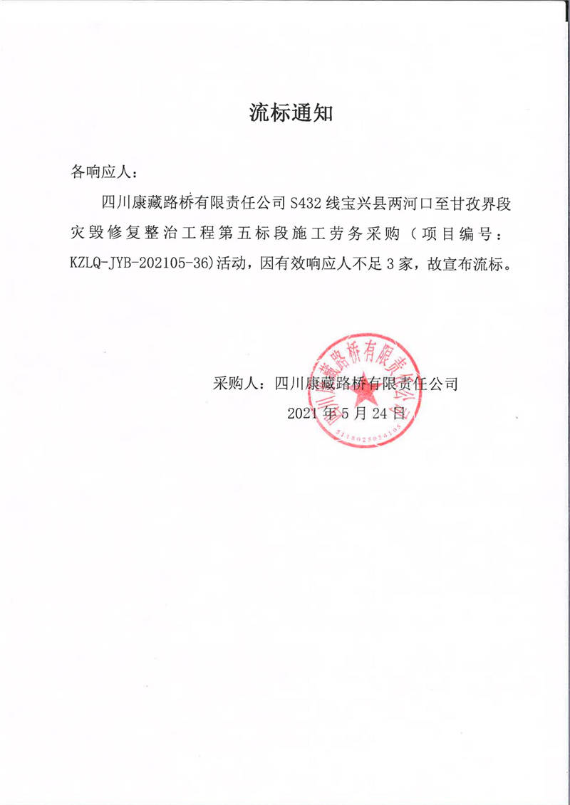四川康藏路橋有限責(zé)任公司S432線寶興縣兩河口至甘孜界段災(zāi)毀修復(fù)整治工程第五標(biāo)段施工勞務(wù)采購流標(biāo)通知