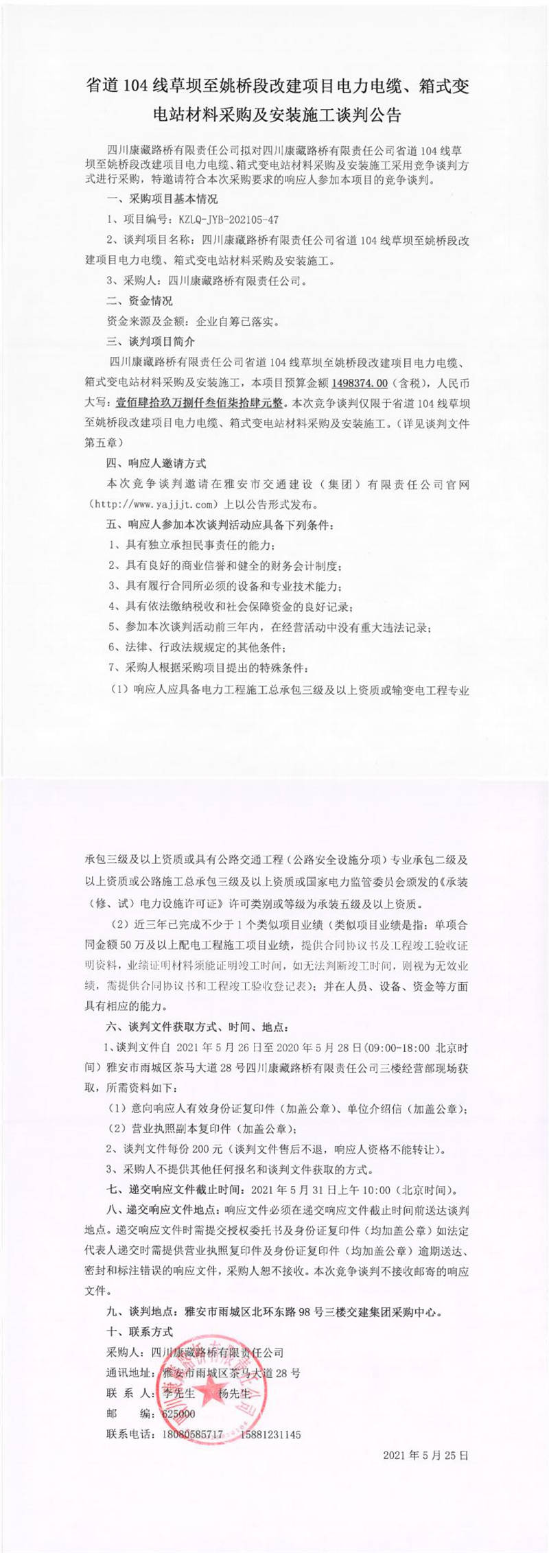 四川康藏路橋有限責任公司省道104線草壩至姚橋段改建項目電力電纜、箱式變電站材料采購及安裝施工談判公告