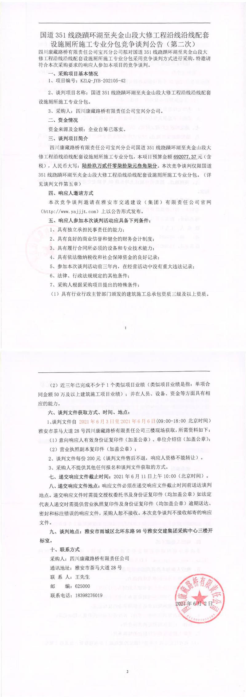 四川康藏路橋有限責(zé)任公司寶興分公司國道351線蹺磧環(huán)湖至夾金山段大修工程沿線沿線配套設(shè)施廁所施工專業(yè)分包競(jìng)爭(zhēng)談判公告(第二次)