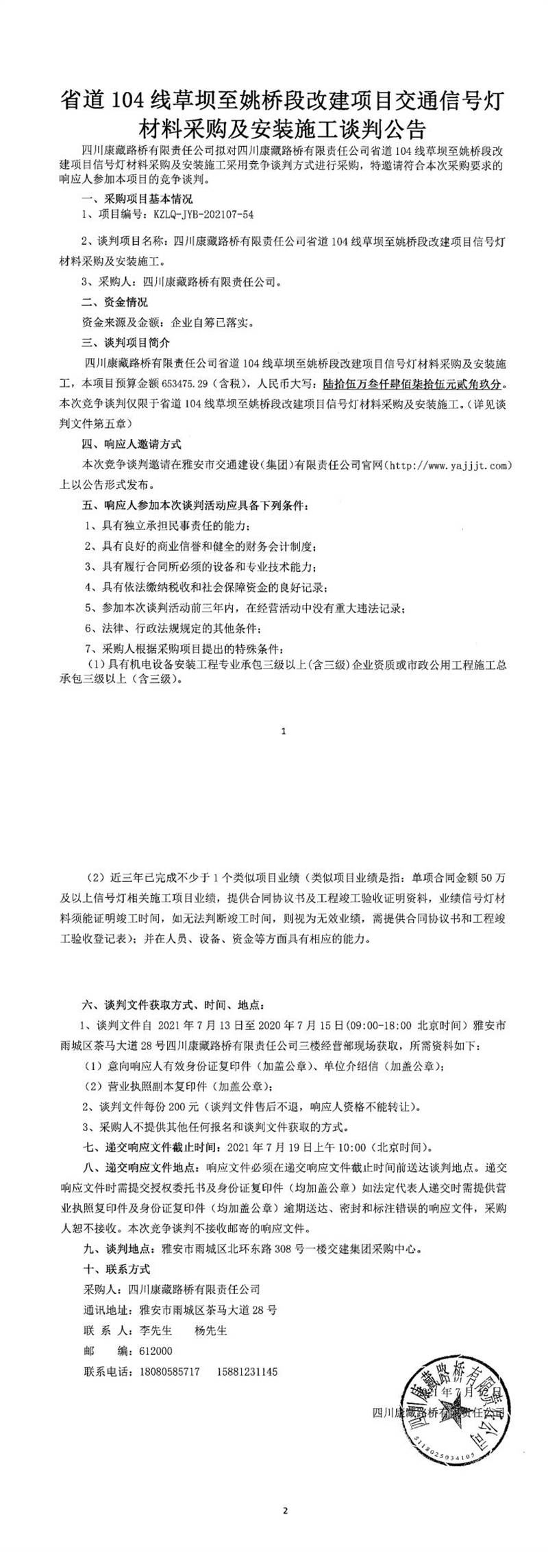 四川康藏路橋有限責(zé)任公司省道104線草壩至姚橋段改建項(xiàng)目交通信號燈材料采購及安裝施工競爭談判公告