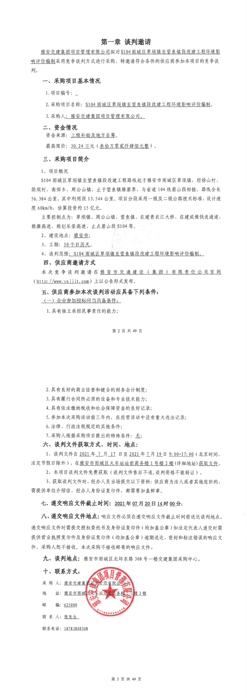 雅安交建集團(tuán)項目管理有限公司S104雨城區(qū)草壩鎮(zhèn)至望魚段改建工程環(huán)境影響評價編制競爭談判公告