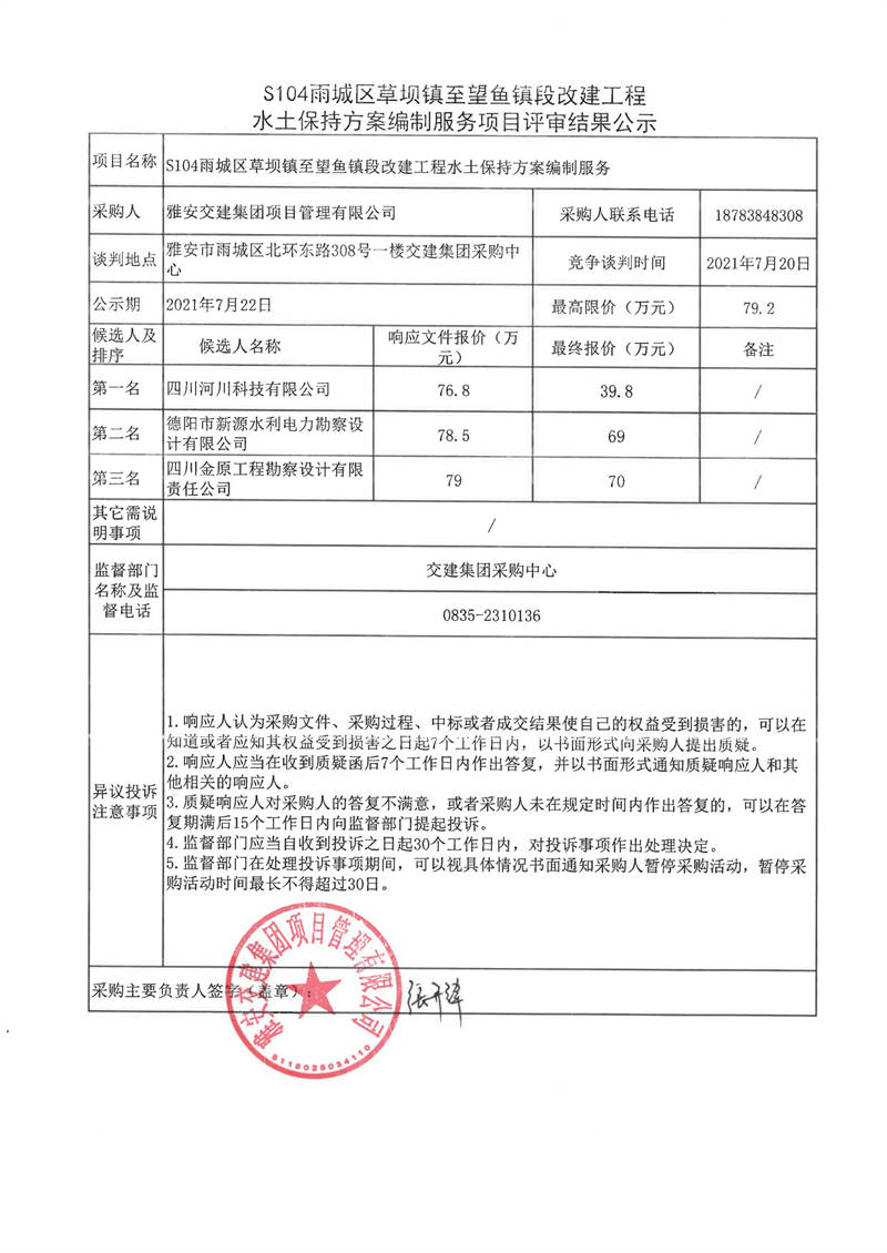 雅安交建集團(tuán)項目管理有限公司S104雨城區(qū)草壩鎮(zhèn)至望魚鎮(zhèn)段改建工程水土保持方案編制服務(wù)項目評審結(jié)果公示