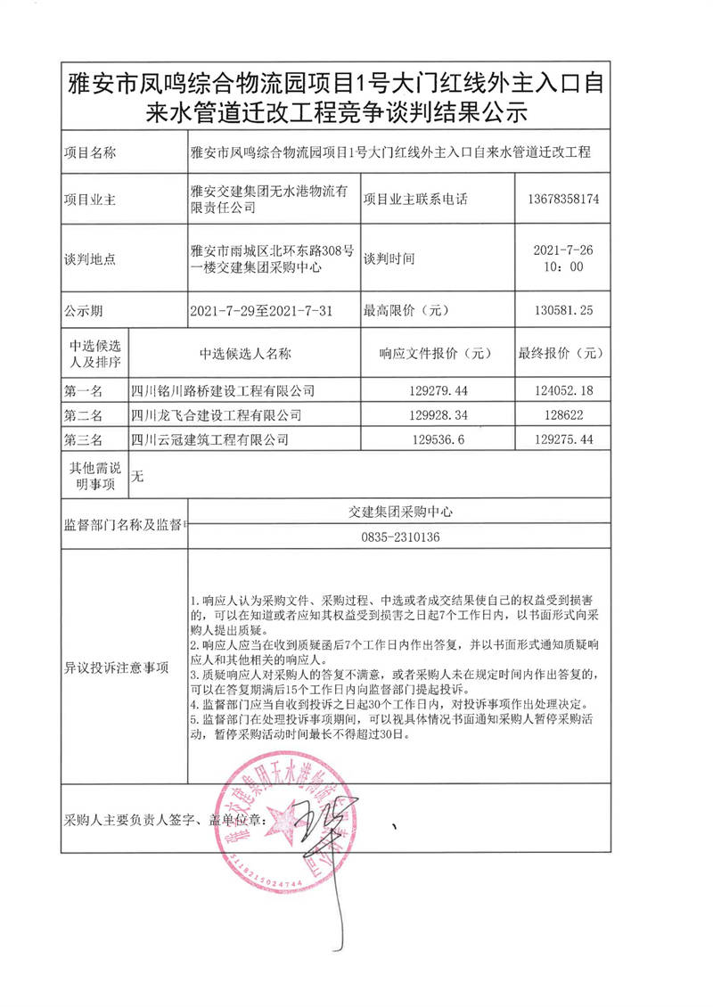 雅安交建集團(tuán)無(wú)水港物流有限責(zé)任公司雅安市鳳鳴綜合物流園項(xiàng)目1號(hào)大門紅線外主入口自來(lái)水管道遷改工程競(jìng)爭(zhēng)談判結(jié)果公示