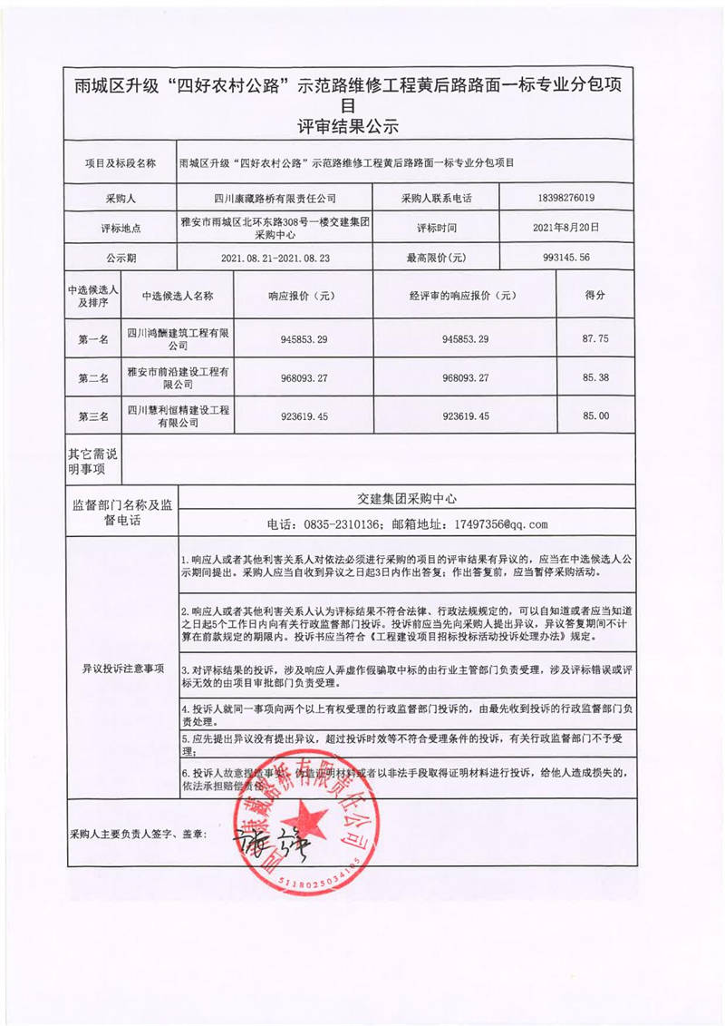 四川康藏路橋有限責(zé)任公司雨城區(qū)升級“四好農(nóng)村公路”示范路維修工程黃后路路面一標專業(yè)分包項目評審結(jié)果公示