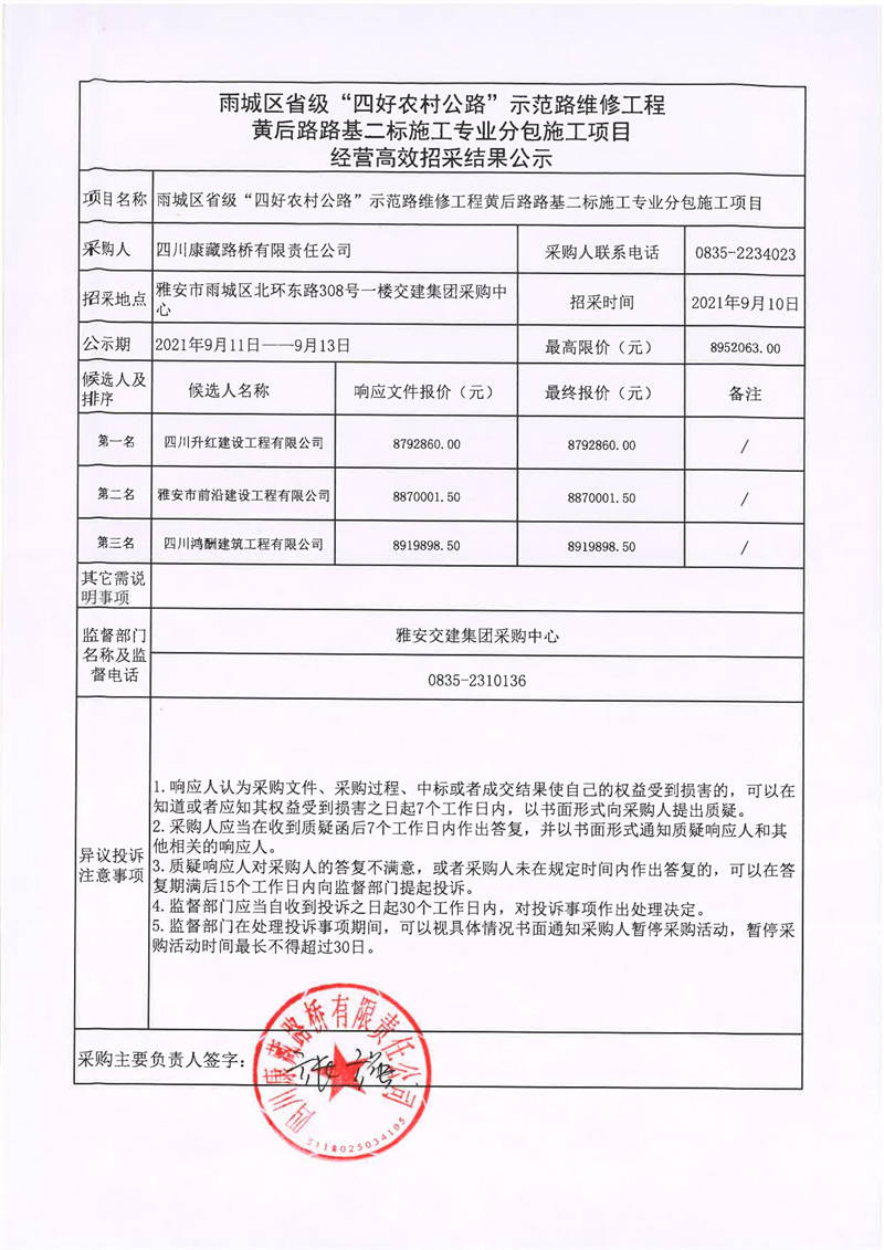 四川康藏路橋有限責(zé)任公司雨城區(qū)省級(jí)“四好農(nóng)村公路”示范路維修工程黃后路路基二標(biāo)施工專(zhuān)業(yè)分包施工項(xiàng)目經(jīng)營(yíng)高效招采結(jié)果公示