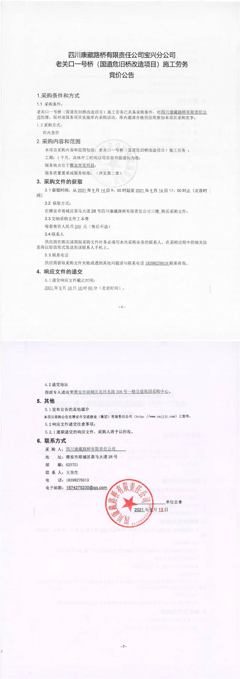 四川康藏路橋有限責(zé)任公司寶興分公司老關(guān)口一號橋(國道危舊橋改造項目)施工勞務(wù)競價公告