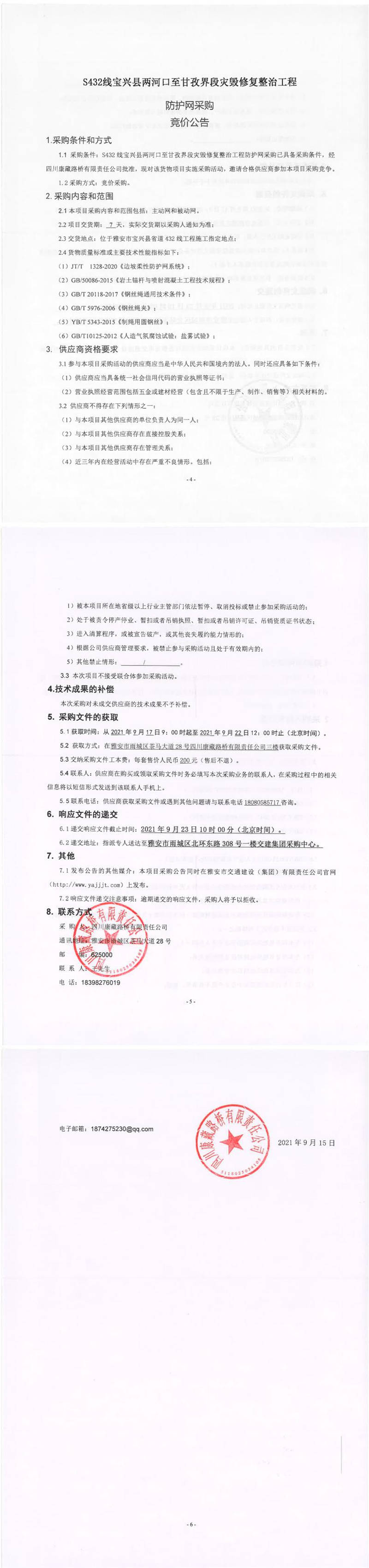 四川康藏路橋有限責(zé)任公司S432線寶興縣兩河口至甘孜界段災(zāi)毀修復(fù)整治工程防護(hù)網(wǎng)采購(gòu)競(jìng)價(jià)公告