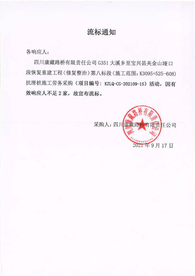 四川康藏路橋有限責任公司G351大溪鄉(xiāng)至寶興縣夾金山埡口段恢復重建工程(修復整治)第八標段(施工范圍:K3095+525-608)抗滑樁施工勞務采購流標通知