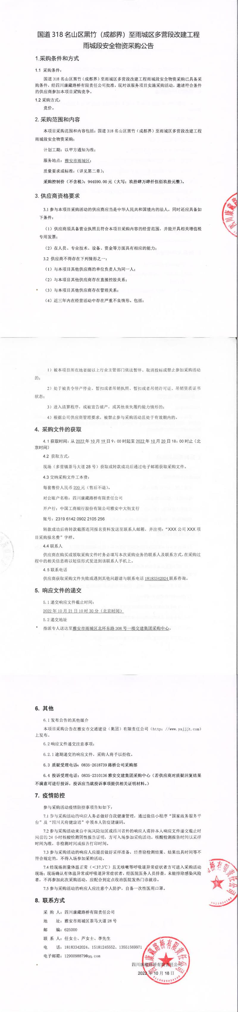 四川康藏路橋有限責任公司國道318名山區(qū)黑竹(成都界)至雨城區(qū)多營段改建工程雨城段安全物資采購公告