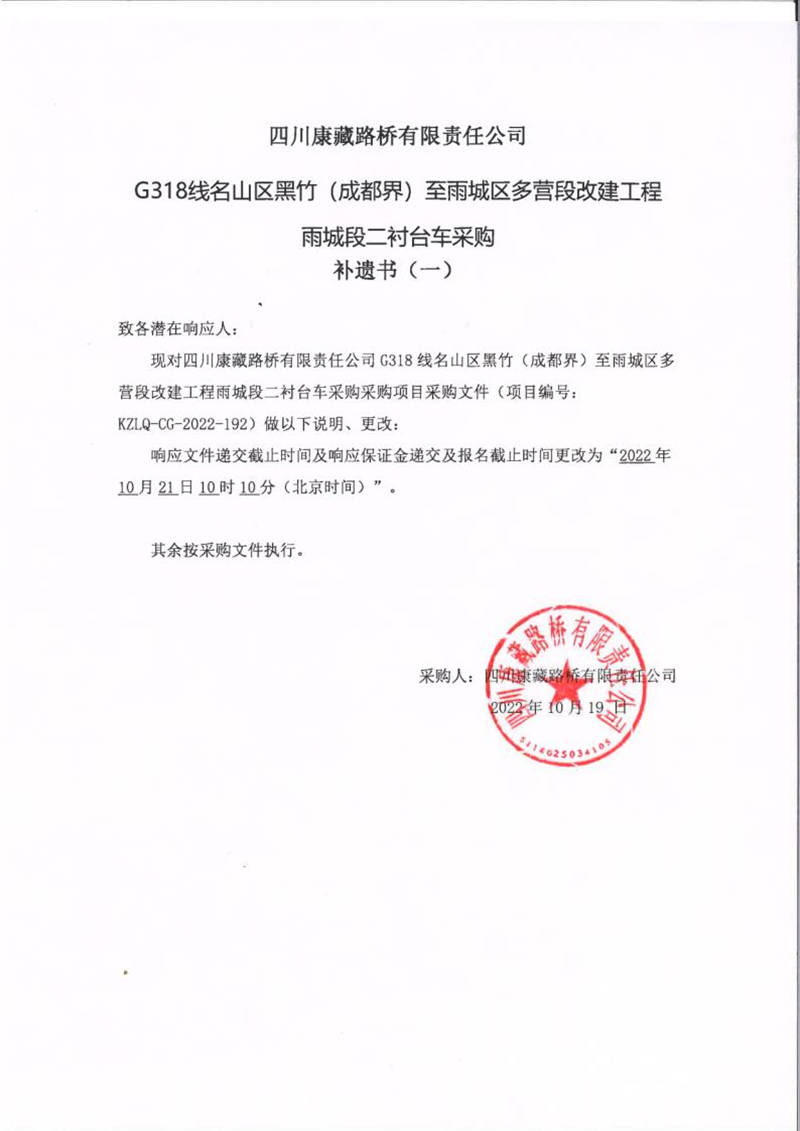 四川康藏路橋有限責(zé)任公司G318線名山區(qū)黑竹(成都界)至雨城區(qū)多營段改建工程雨城段二襯臺車采購補(bǔ)遺書(一)