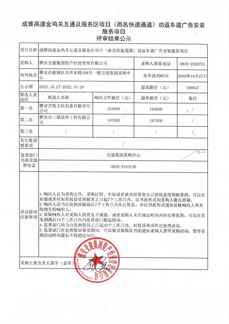 雅安交建集團(tuán)資產(chǎn)經(jīng)營管理有限公司成雅高速金雞關(guān)互通及服務(wù)區(qū)項目(雨名快速通道)勸返車道廣告安裝服務(wù)項目評審結(jié)果公示