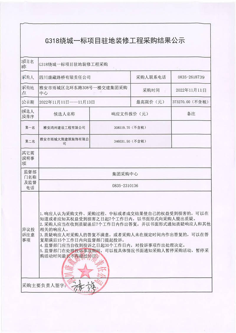 四川康藏路橋有限責(zé)任公司G318繞城一標(biāo)項(xiàng)目駐地裝修工程采購(gòu)結(jié)果公示