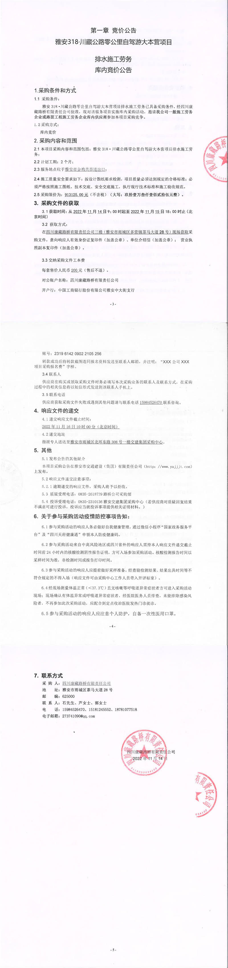 四川康藏路橋有限責任公司雅安318.川藏公路零公里自駕游大本營項目排水施工勞務庫內(nèi)競價公告
