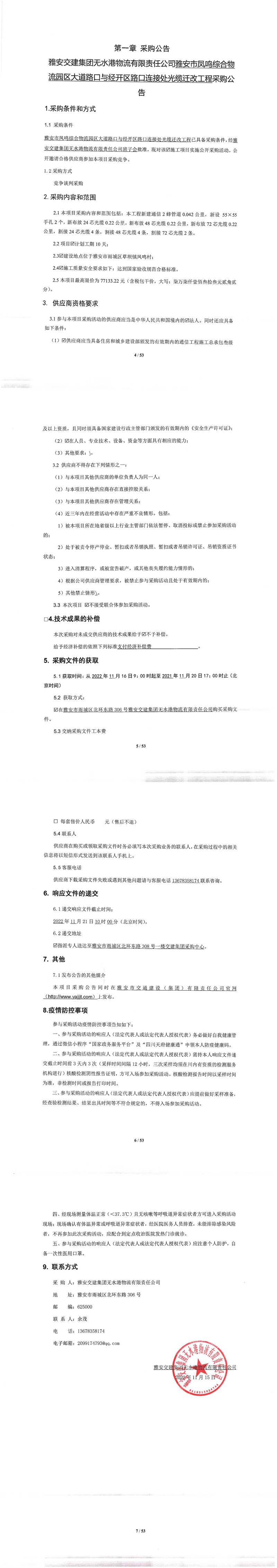 雅安交建集團(tuán)無水港物流有限責(zé)任公司雅安市鳳鳴綜合物流園區(qū)大道路口與經(jīng)開區(qū)路口連接處光纜遷改工程采購(gòu)公告