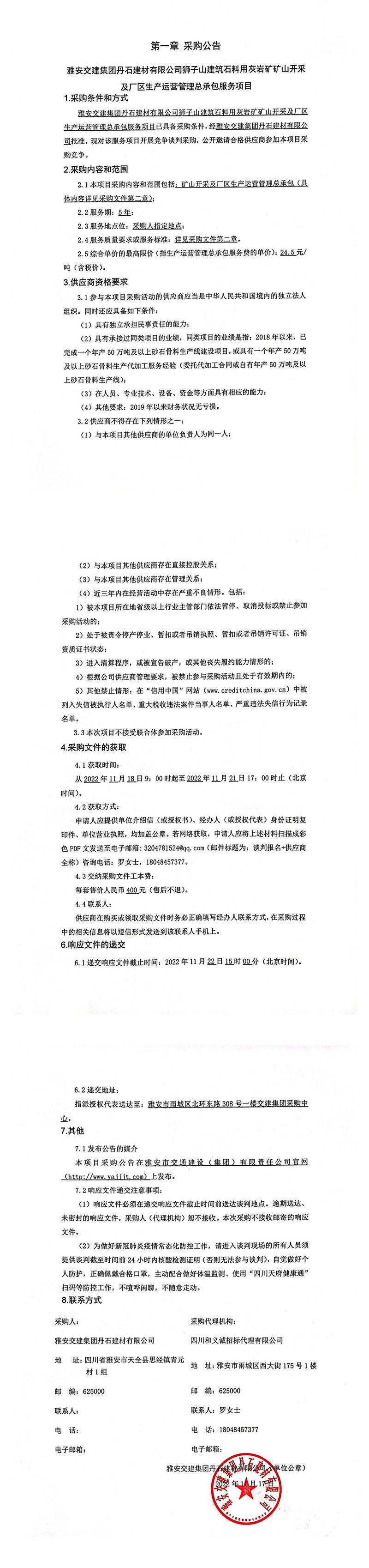 雅安交建集團(tuán)丹石建材有限公司獅子山建筑石料用灰?guī)r礦礦山開采及廠區(qū)生產(chǎn)運營管理總承包服務(wù)項目采購公告