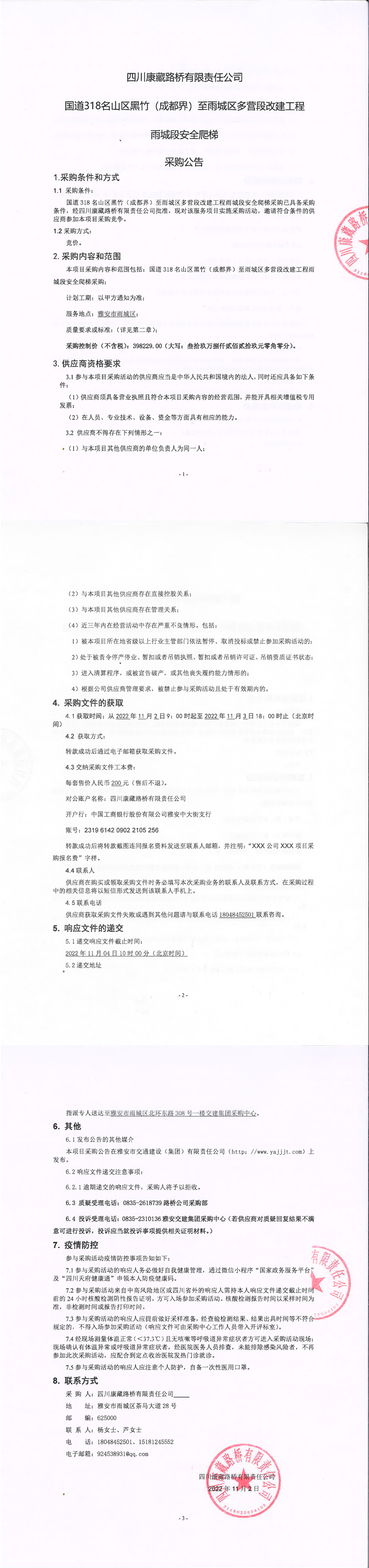 四川康藏路橋有限責(zé)任公司國道318名山區(qū)黑竹(成都界)至雨城區(qū)多營段改建工程雨城段安全爬梯采購公告
