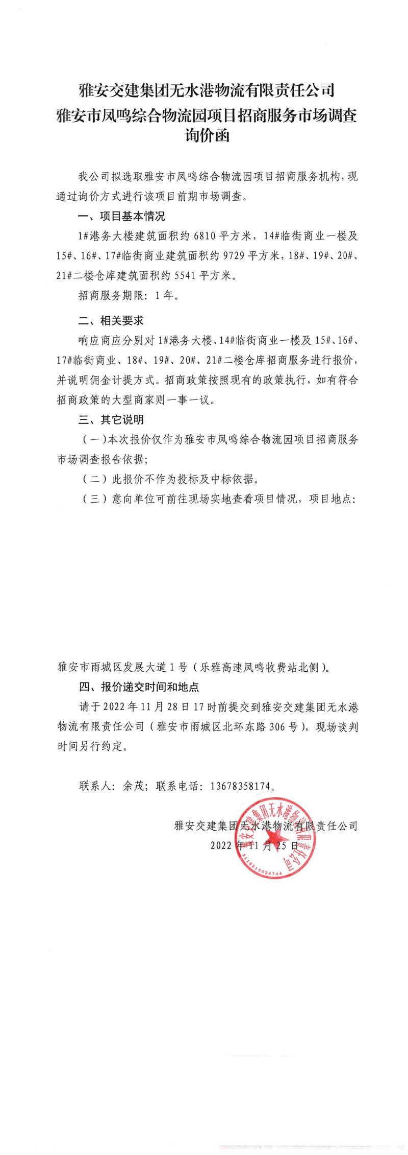 雅安交建集團(tuán)無(wú)水港物流有限責(zé)任公司雅安市鳳鳴綜合物流園項(xiàng)目招商服務(wù)市場(chǎng)調(diào)查詢價(jià)函
