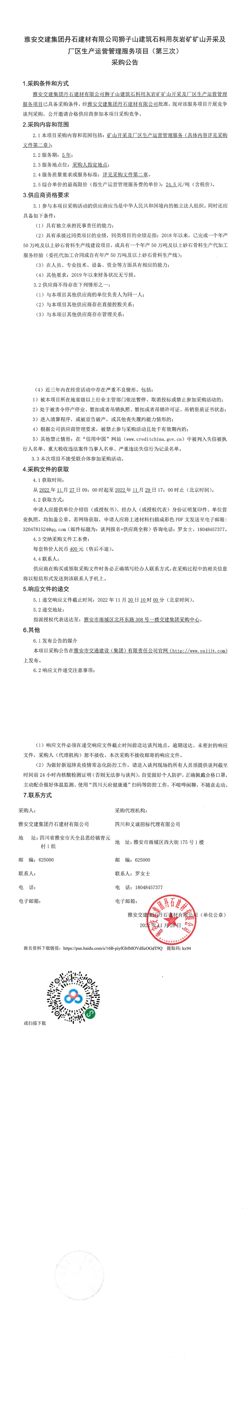 雅安交建集團(tuán)丹石建材有限公司獅子山建筑石料用灰?guī)r礦礦山開采及廠區(qū)生產(chǎn)運(yùn)營管理服務(wù)項(xiàng)目(第三次)采購公告