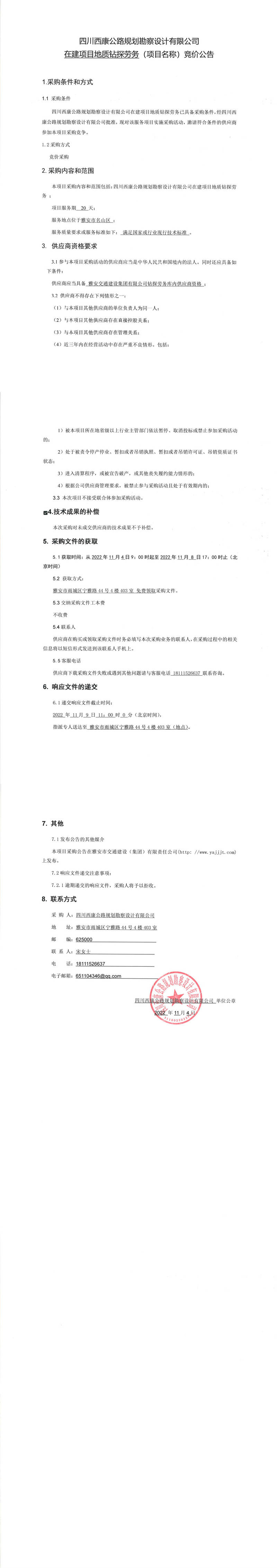 四川西康公路規(guī)劃勘察設計有限公司在建項目地質(zhì)鉆探勞務(項目名稱)競價公告
