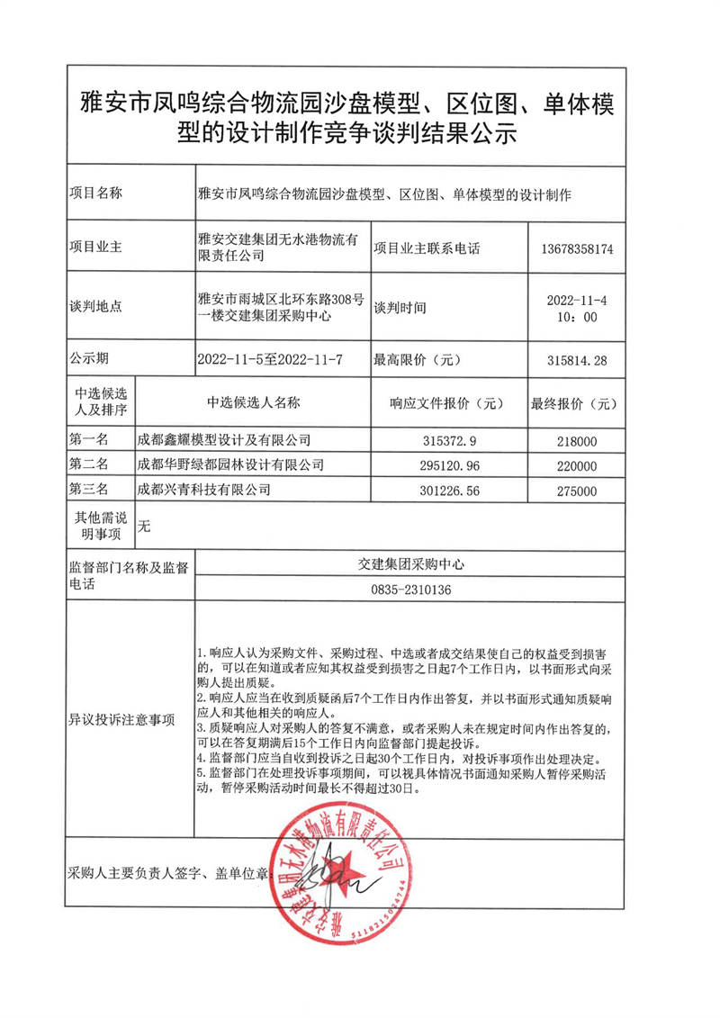 雅安交建集團無水港物流有限責任公司雅安市鳳鳴綜合物流園沙盤模型、區(qū)位圖、單體模型的設計制作競爭談判結(jié)果公示
